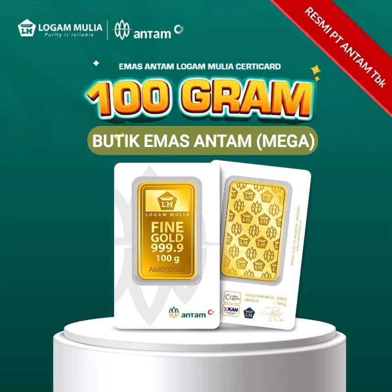 Emas Logam Mulia ANTAM 100 gramEmas Logam Mulia produksi PT. ANEKA TAMBANG berukuran 100 gram Kadar Emas : 24 K